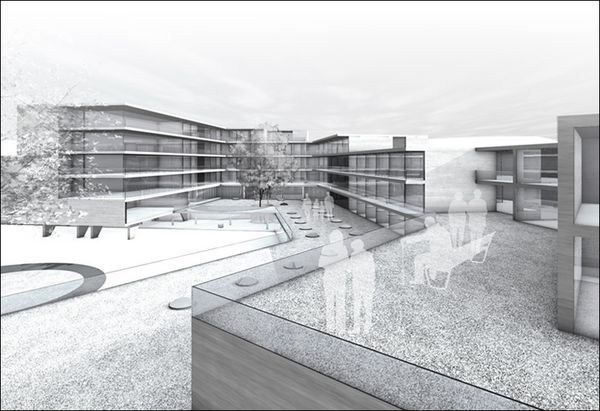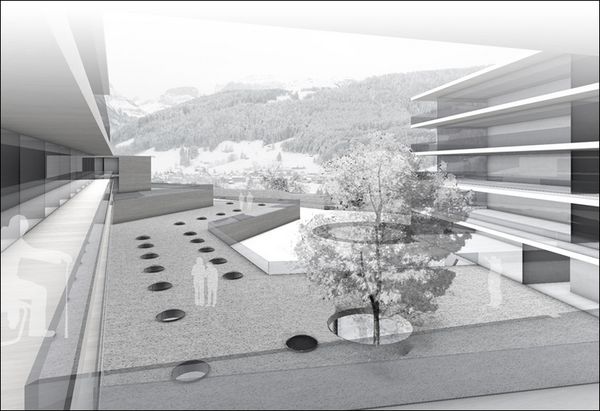 Der Lösungsvorschlag für das Überbauungs-konzept schliesst an den vorhandenen Lagequalitäten und insbesondere an der auf diesen Qualitäten abgestimmten bestehenden Bausubstanz an und schreibt sie weiter. Die sich öffnende Geste der Anlage auf den Alpstein und den Ort Appenzell wird weiterentwickelt und die Neubauten in die bestehende Topografie eintariert.Ein neuer Spitaltrakt wird so situiert, dass er sowohl verbindende wie auch ordnungsträgende Funktionen in der Anlage übernimmt. Der neue Spitaltrakt ist als Kopfbau ausgebildet welcher den neuen Eingangsbereich signalisiert und so die Adresse des Gesundheitszentrums Appenzell stärkt.