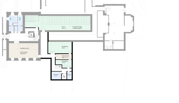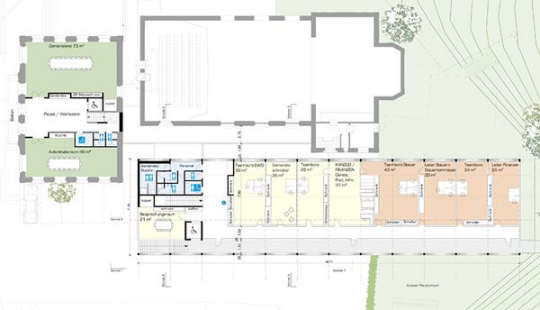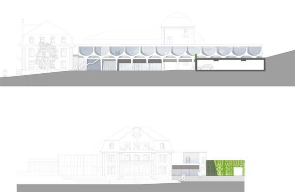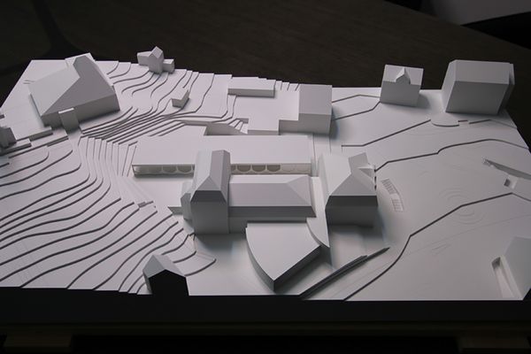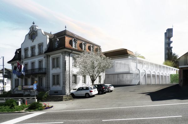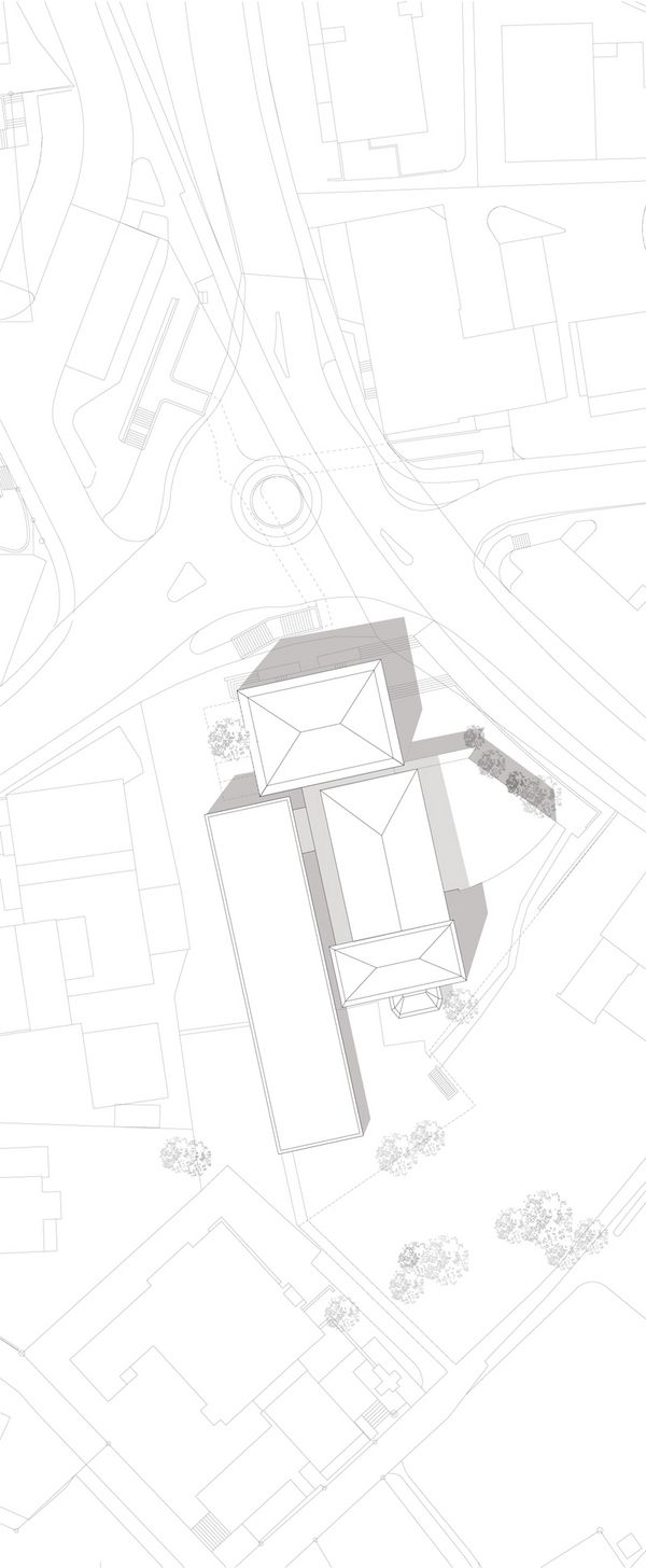 Das Konzept basiert auf einer volumetrischen, wie auch erschliessungstechnischen Entflechtung. Mit einem flach gehaltenen und vom Bestand abgesetzten Neubau wird das „Volumen- Konglomerat“ aus verschieden Bauepochen städtebaulich beruhigt.