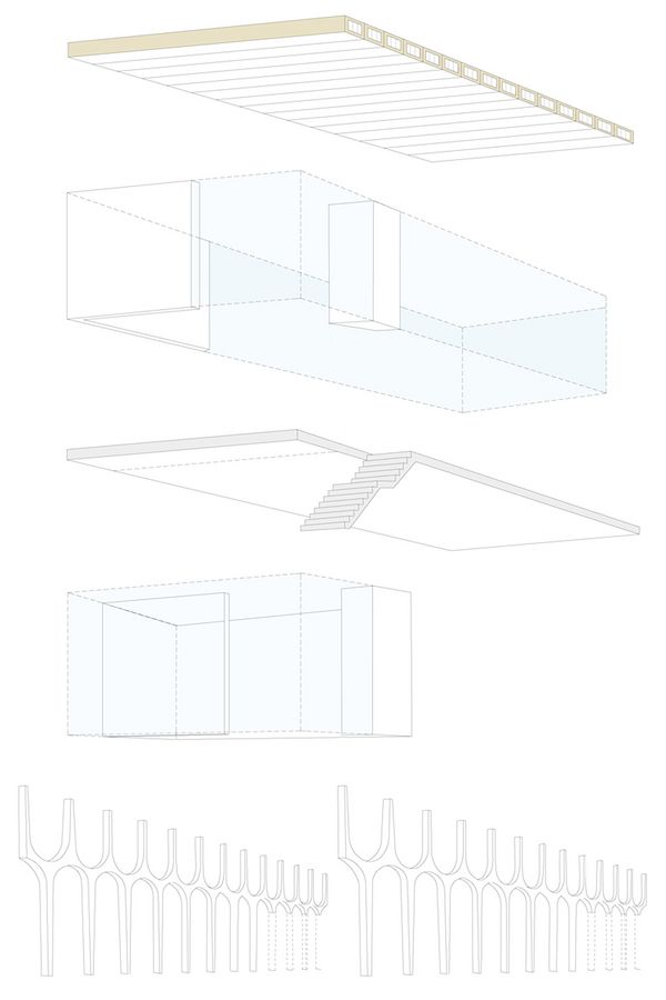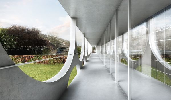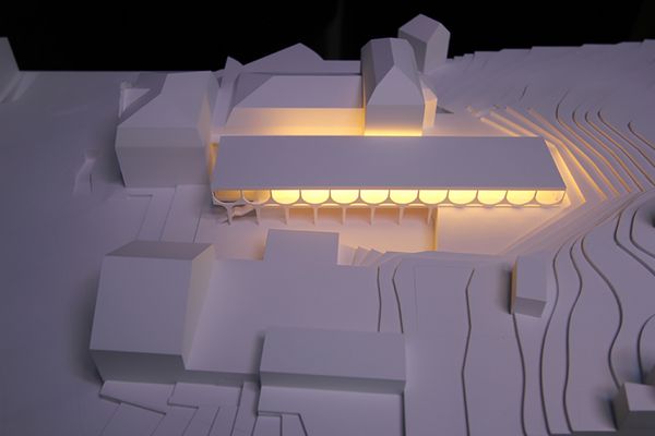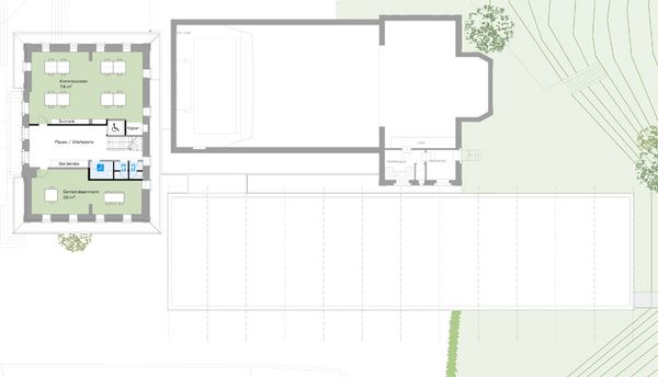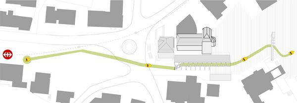Der Neubau ist als funktionales Passstück konzipiert, welches die Räumlichkeiten der Tageszone effizient auf einem Geschoss organisiert, die gedeckte Anlieferung der Bühne und des Caterings sicherstellt, und den Wander- /Kirchenweg attraktiv über eine Passerelle führt. Der durch den Neubau generierte, gedeckte Aussenraum soll nebst der Anlieferung auch als Marktplatz dienen.