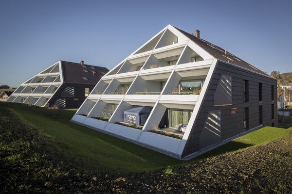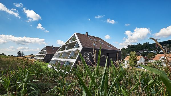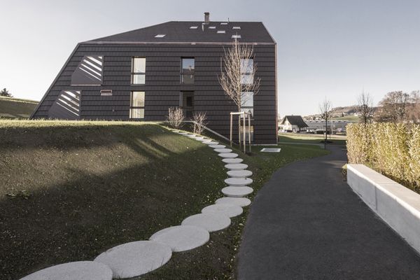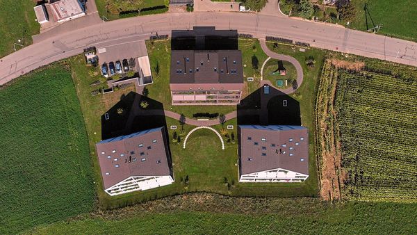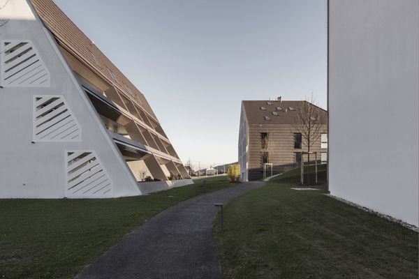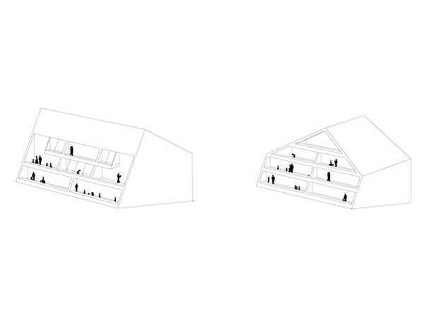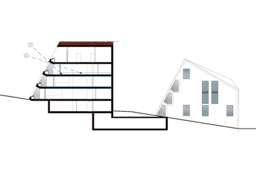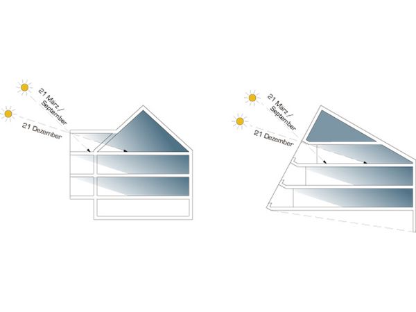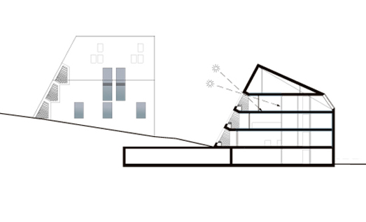 Nebst der ortsbaulichen Konzeption, basiert die grundlegende Projektidee auf einer Maximierung der solaren Gewinne. Um dies zu erreichen sind die südlichen Dachflächen /Fassaden auf den Sonnenstand des Winterhalbjahres ausgerichtet. Die Decken sind so zurückgestaffelt, damit die winterliche Sonne (Tiefstand 21. Dez.: 18°) möglichst tief in den Baukörper einfallen kann, um so die höchst möglichen solaren Gewinne zu erzielen. Damit sich der Baukörper im Sommerhalbjahr (Equinox 21. März bis 21.Sept.: 43°) nicht aufheizt, ist die Deckengeometrie so ausgebildet, dass die Mittagssonne vom Frühling bis Herbst nicht mehr in den Raum eintreffen kann und somit der Raum nicht unnötig aufgeheizt wird.
