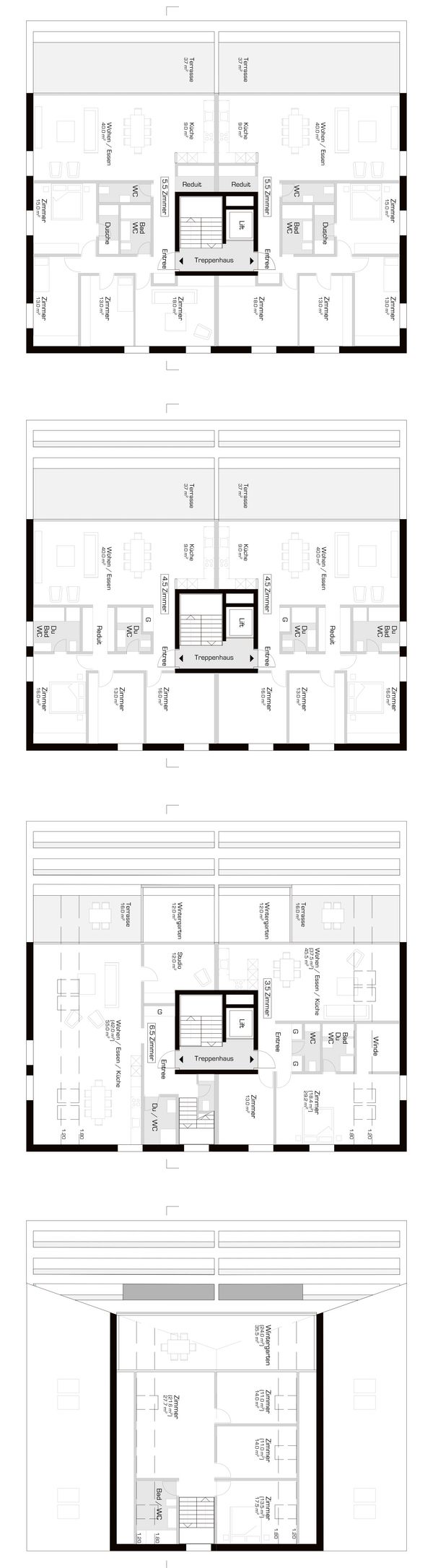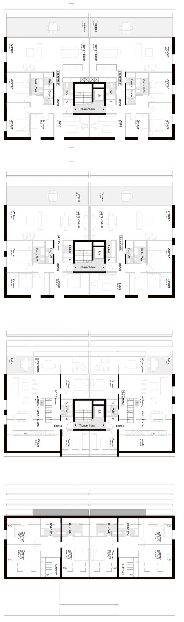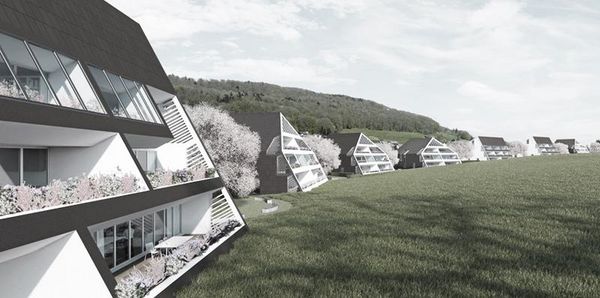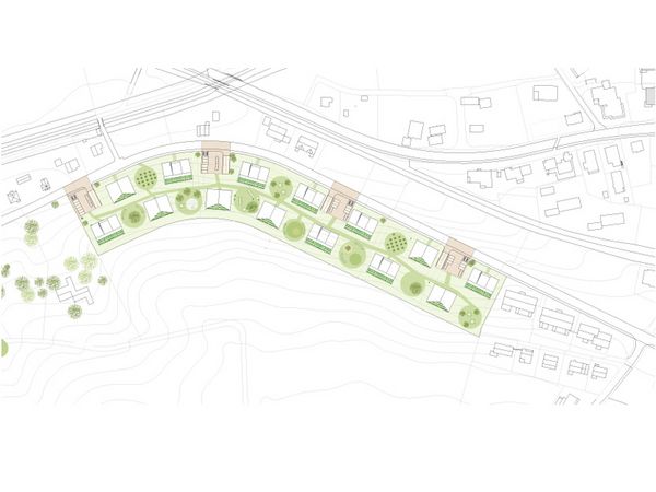 Die alternierende Anordnung der Baukörper verspricht eine maximale Freiheit der Aussenräume und demzufolge eine maximale Besonnungs- und Aussichtssituation sämtlicher Wohnungen. Zwischen den Häusern sind runde „Parkinseln“ mit unterschiedlicher Ausstattung angeordnet. Die Inseln werden als Spielinseln, als Grillinseln, als Leseinseln oder als Waldinseln mit Zwergbäumen zum spielen ausgestattet. Parkartig führt eine innere Fusswegerschliessung von Haus zu Haus und von Parkinsel zu Parkinsel. Damit soll ein weitläufiger Austausch der Bewohner erzielt werden. Indem die beiden Haustypen in einer regellosen und willkürlichen Abfolge angeordnet sind, soll die gesamte Anlage eine suburbane und dörfliche Stimmung ausstrahlen.