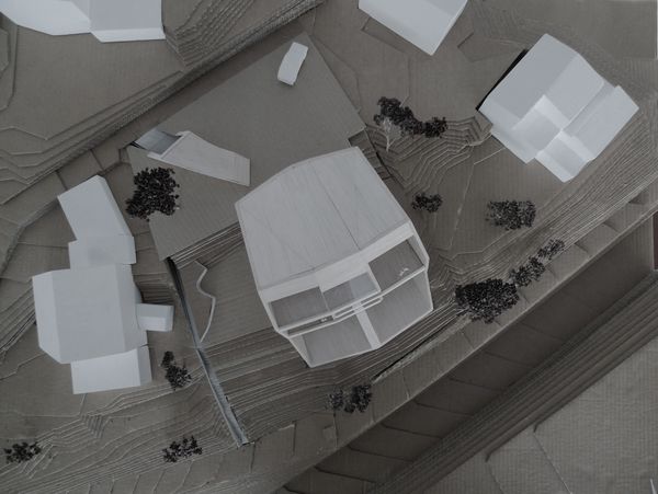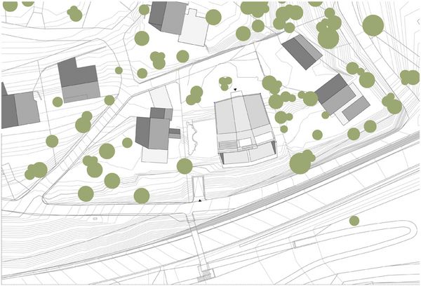 Die Grundrissform bezieht sich auf die trapezförmige Parzellengeometrie, deren Breitseite sich auf der südlichen Hangseite befindet. Der Baukörper ist im Zentrum des Freiraums der beiden Nachbarbauten angeordnet und rechtwinklig zum Hangverlauf ausgerichtet. Unter dem Hochbau findet sich die unterirdisch eingelassene Einstellhalle deren Zufahrt über eine Rampe erfolgt.