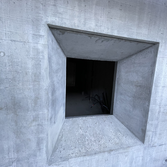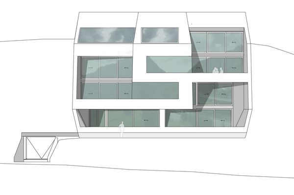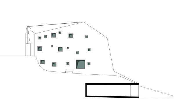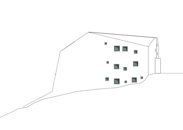 Der Kompakte Baukörper, ist im Untergeschoss sichtbar in den Berg eingelassen, wodurch eine tiefgreifende Einbettung und eine standfeste „Verwurzelung“ suggeriert wird.