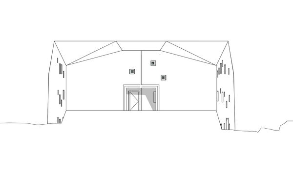Der Baukörper öffnet sich vollständig gegen Süden, während die Nordfassade und insbesondere die beiden Seitenfassaden nur durch kleine Fensteröffnungen perforierte sind.