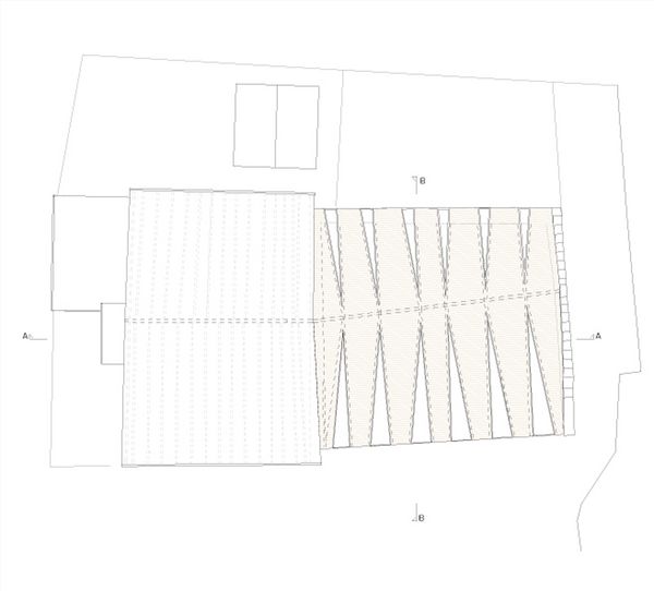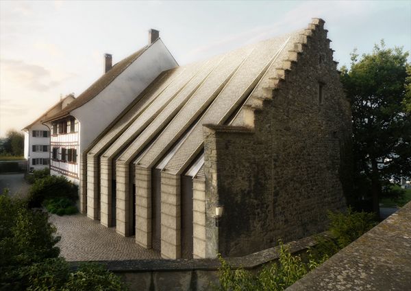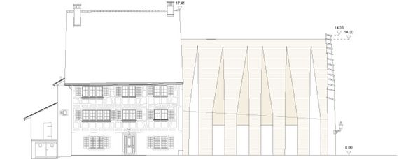 Zwischen den Kreuzrippenträger formen sich die Glasbänder vom Boden bis zum First und führen das Licht lateral wie auch zenital in das innere des Baukörpers. Die neue Aussenhülle besteht aus Lehm und Lehmziegel. Die Haptik, wie auch die Farbigkeit dieses Materials verspricht eine Nähe zum Kontext und somit einen Einklang mit der historischen Stadtmauer.