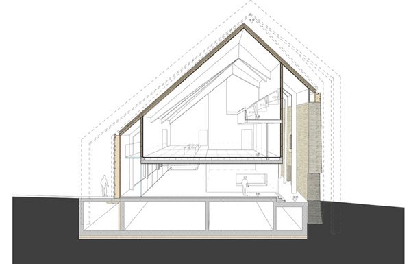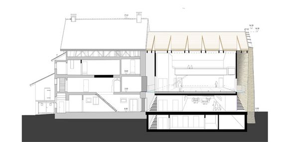 Der neue Saal wird im wahrsten Sinn als Kernstück in einer „Haus im Haus“ Konzeption unter der neuen Gebäudehülle eingebaut. Zenital belichtet und über zwei Seiten Erschlossen steht der neue Saal auf zwei Kuben und ist losgelöst von der primären Kreuzrippenkonstruktion.
