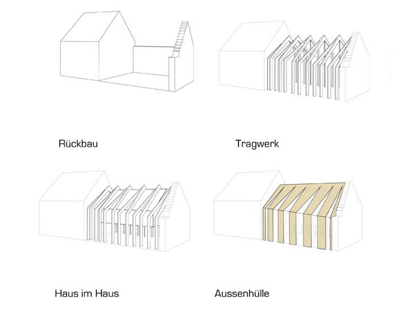 Die Lasten der Aussenhülle, insbesondere der Dachflächen, werden über die neu eingebauten selbst tragenden Kreuzrippenträger, unabhängig von der historischen Stadtmauer abgeleitet. Die Rippen kreuzen sich dabei wie die Diagonalen in einem Rechteck. Sie Leiten die Druck- und Schubkräfte des Gewölbes auf die Pfeiler ab.