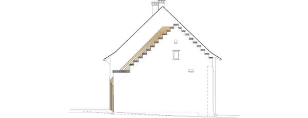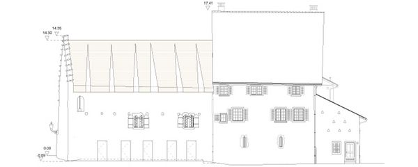 Die Vorsatzschale, welche beim Einbau von 1969 eingebaut worden ist, wird rückgebaut. Das hinter der Vorsatzschale vermutete romanische Bossenquaderwerk wird offen gelegt und im neuen Raumkonzept über die gesamte Fassadenhöhe sichtbar gemacht. Die bestehenden gekuppelten romanischen Rundbogenfenster sind ein integraler Bestandteil des neuen Raum- und Belichtungskonzeptes.