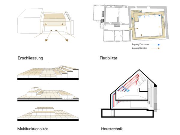 Die Höhenlage des Saals richtet sich nach dem 1. Obergeschoss des Pfarrhauses. Die Vorbereitungsräume (Requisiten, Künstlergarderoben, sowie deren WC und Duschen) sind in diesem Geschoss angeordnet und durch einen Durchbruch mit dem Saal verbunden. Die Künstler haben die Möglichkeit den Saal peripher über die gesamte „bühnenseitige“ Abwicklung zu betreten. Das „Saalfoyer“ erstreckt sich über die gesamte Saalbreite und verbindet die beiden Zugänge. Die Trennwand zum Saal lässt sich mit Schiebefenster über die gesamte Breite öffnen.